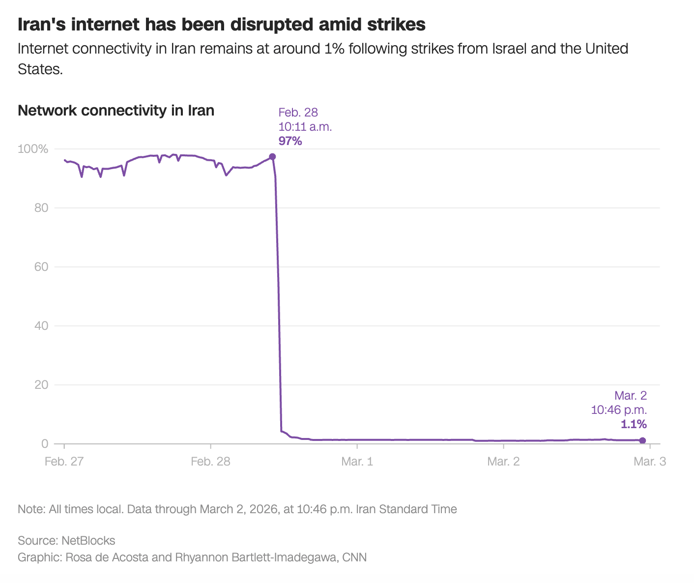 The US and Israel have effectively disconnected Iran from the outside world. With 97% of the country connected to the internet on Friday, now just 1% of the country remains online.