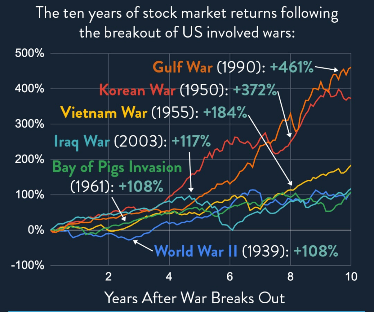 What’s more, history suggest that wars have generally pushed markets higher as government’s increase spending to support their war efforts. This final chart looks at the American S&P 500 ten years after some of the major wars of the past 75 years.