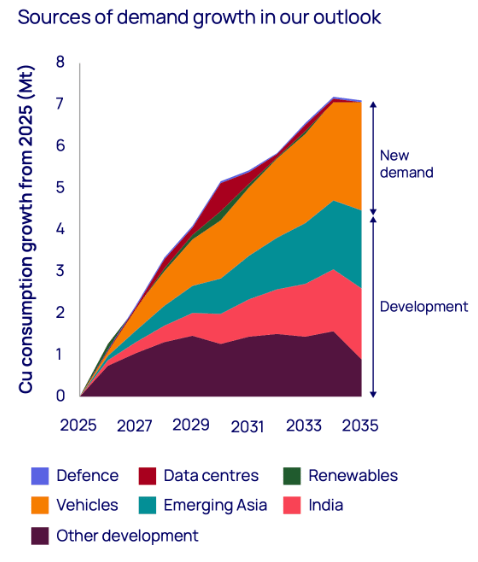 The larger driver of new copper demand is in developing economies, namely India and Southeast Asia. India, Indonesia, the Philippines, Vietnam, and other Southeast Asian countries account for over 2 trillion people, and these countries are experiencing rapid industrialisation and electrification. If these countries industrialise at even 50% of the rate of China, they will require an additional 5.4 million tonnes of copper annually (Wood Mackenzie).