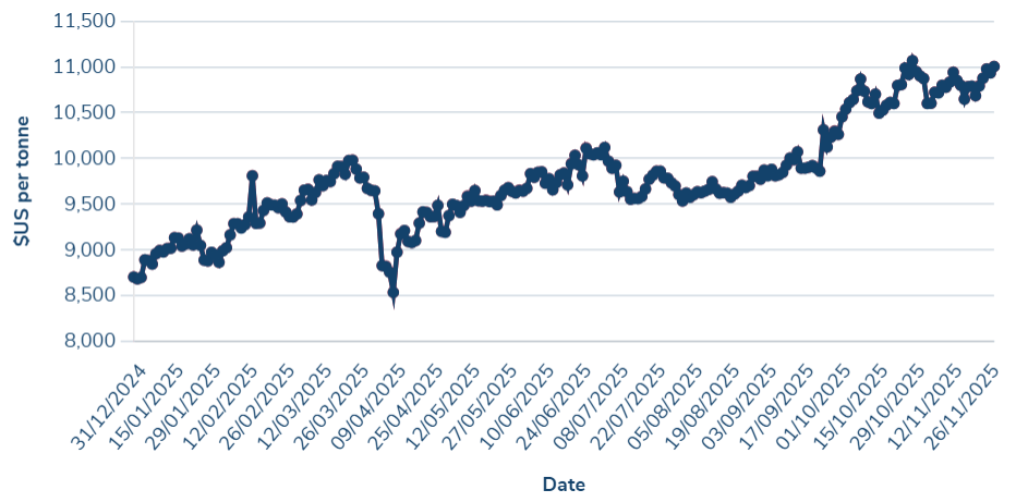 This trend is expected to continue. Last week, UBS estimated a 2026 copper supply deficit of 407,000 tonnes on the basis of mine disruptions continuing in Indonesia, Chile and Peru. As a result, UBS goes on to forecast copper prices reaching US$13,000 per tonne by the end of 2026, a 16% increase from the current US$11,200 (Mining Weekly/UBS, LME).
