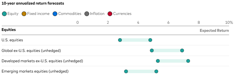 Vanguard believes an international preference is a long-term play, forecasting developed markets outside the US will outperform the US over a 10-year horizon: